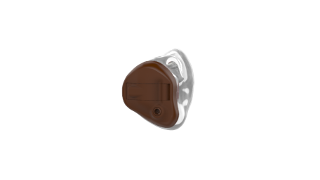 Aparelhos auditivos personalizados ajustados no canal auditivo. Uma pequena parte do aparelho auditivo aparece fora da orelha.