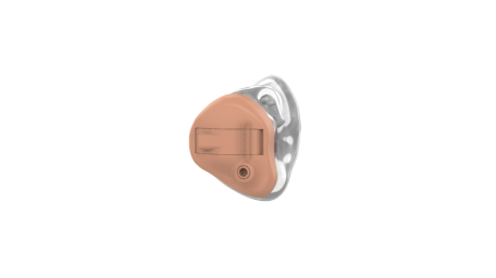 Aparelhos auditivos personalizados ajustados no canal auditivo. Uma pequena parte do aparelho auditivo aparece fora da orelha.